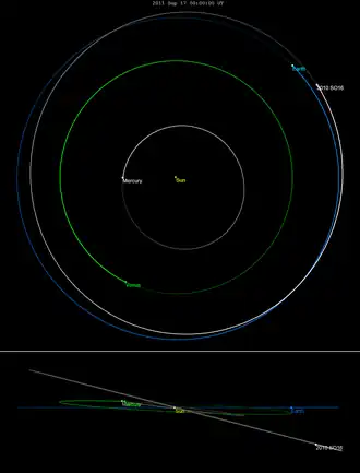 2010 SO16 has a horseshoe orbit that allows it to stably share Earth's orbital neighborhood without colliding with it. It is one of a handful of known asteroids with an Earth-following orbit, a group that includes 3753 Cruithne, and the only known asteroid in an horseshoe orbit with Earth. It is, however, neither an Aten asteroid nor an Apollo asteroid because the semi-major axis of its orbit is neither less than nor greater than 1 AU, but oscillates between approximately 0.996 and 1.004 AU, with a period of about 350 years.[5] In its ~350 yr horseshoe cycle, it never approaches Earth more closely than about 0.15 AU, alternately trailing and leading.