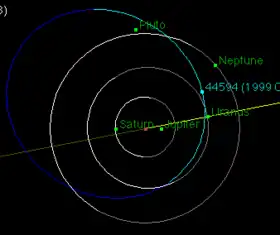 (44594) 1999 OX3 is an eccentric trans-Neptunian object with a centaur-like orbit from the outer Solar System, approximately 150 kilometers in diameter.[3] It was discovered on 21 July 1999, by astronomers John Kavelaars, Brett Gladman, Matthew Holman and Jean-Marc Petit at Mauna Kea Observatories, Hawaii, United States.[5]