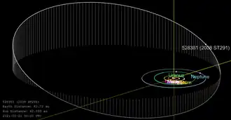 (528381) 2008 ST291, provisional designation 2008 ST291, is a 1:6 resonant trans-Neptunian object located in the outermost region of the Solar System that takes almost a thousand years to complete an orbit around the Sun.[5] It was discovered on 24 September 2008 by American astronomers Megan Schwamb, Michael Brown and David Rabinowitz at the Palomar Observatory in California, with no known earlier precovery images.[1]
