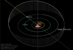 (90568) 2004 GV9 (provisional designation 2004 GV9) is a trans-Neptunian object that was discovered on April 13, 2004 by NEAT.[1] It has been listed as a cubewano by the Minor Planet Center.[2] It was discovered on 13 April 2004 by NEAT. It has been observed forty-seven times, with precovery images back to 1954.[4] The object has an orbital period of 273.88 years. Its maximum distance from the Sun (aphelion) is 45.62 AU, and its closest (perihelion) is 38.7 AU. It has an inclination of 21.9718° and an eccentricity of 0.082.