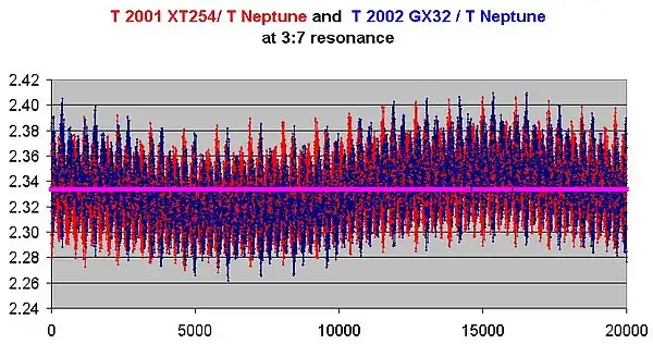 Simulations by Emel'yanenko and Kiseleva in 2007 show that 2002 GX32 has a 99% probability of libration in a 3:7 resonance with Neptune.[7]