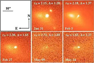 108P/Ciffréo is a periodic comet with an orbital period of 7 years discovered by Jacqueline Ciffréo on November 8, 1985.[5] The comet is noted for having a peculiar double morphology, in which the nucleus is accompanied by a comoving, detached, diffuse tail, which is probably a perspective artifact of particles ejected sunwards and then repelled by solar wind.[4][6]