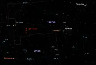 119 Tauri (also known as CE Tauri) is a red supergiant star in the constellation Taurus. It is a magnitude 4 star, visible to the naked eye under good observing conditions. A semiregular variable, its angular diameter has been measured at about 10 mas. It is a similar star to Betelgeuse although redder and more distant.[6]