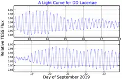 The variable star designation of the primary is DD Lacertae,[18] while 12 Lacertae is the Flamsteed designation.[12] In general terms it varies in magnitude from 5.16 down to 5.28 with a period of 4.63 hours.[18] As many as eleven different frequencies have been detected, with the dominant cycle showing a frequency of 5.179034 cycles per day. Curiously, three of the frequencies form an equally-spaced triplet with cycles of 5.179, 5.334, and 5.490 per day, although this alignment appears to be a coincidence.[5] It is a hybrid pulsator, showing mixed behaviors of a Beta Cephei variable and a slowly pulsating B-type star.[19]