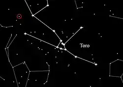 136 Tauri is a white-hued binary star system in the zodiac constellation of Taurus. It has a combined apparent visual magnitude of 4.56,[2] which is bright enough to be faintly visible to the naked eye. Based upon an annual parallax shift of 7.71±0.22 mas as seen from Earth's orbit,[1] it is located approximately 420 light years from the Sun. The system is moving nearer with a heliocentric radial velocity of −17.2 km/s,[5] and is expected to make its closest approach in 6.5 million years at a distance of 150 ly (45 pc).[2]