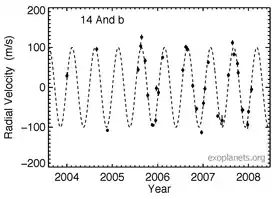 ![]() Radial velocity changes over time of 14 Andromedae caused by the orbit of 14 Andromedae b. | |