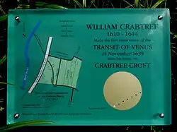 On 9 June 2004, the day after the first of a 21st-century pair of Venus transits occurred as predicted by Horrocks, a commemorative street nameplate in memory of William Crabtree was unveiled at the junction of Lower Broughton Road and Priory Grove, which marks the northern boundary of Crabtree Croft.[24] In December 2005, a commemorative plaque was unveiled a few yards away near Ivy Cottage on Lower Broughton Road, which is thought to have been the home of Crabtree and his family at the time he was collaborating with Horrocks.[24] The second transit of the pair occurred on 5 and 6 June 2012, and was marked by a celebration held in the church at Much Hoole, which was streamed live worldwide on the NASA website.[25] A celebration was also held at Crabtree's former home in Broughton when NASA broadcast a re-creation of the observation at Ivy Cottage, inspired by the Ford Madox Brown mural, to millions of viewers, and projected a live video stream of the transit from Hawaii onto the side of the house.[26]
