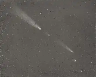 16P/Brooks, also known as Brooks 2, is a periodic comet discovered by William Robert Brooks on July 7, 1889, but failed to note any motion. He was able to confirm the discovery the next morning, having seen that the comet had moved north. On August 1, 1889, the famous comet hunter Edward Emerson Barnard discovered two fragments of the comet labeled "B" and "C" located 1 and 4.5 arc minutes away. On August 2, he found another four or five, but these were no longer visible the next day. On August 4, he observed two more objects, labeled "D" and "E". "E" disappeared by the next night and "D" was gone by the next week. Around mid-month, "B" grew large and faint, finally disappearing at the beginning of September. "C" managed to survive until mid-November 1889. The apparition ended on January 13, 1891. After the discovery apparition, the comet has always been over two magnitudes fainter.