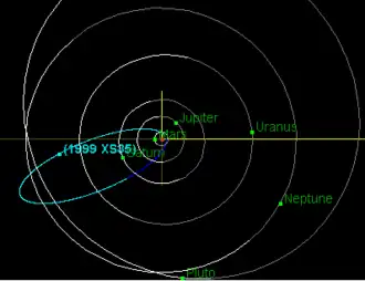 1999 XS35 is a near-Earth object discovered in 1999 having a comet-like orbit. Its semi-major axis is 17.8 AU. Its orbital eccentricity is 0.94, which means that at the perihelion 1999 XS35 comes as close as 0.9 AU to the Sun, while at the aphelion it reaches beyond the orbit of Neptune.[2] 1999 XS35 is a damocloid. 1999 XS35 is a small object with an absolute magnitude (H) of 17.2, which implies a size of about 1 km.[4]