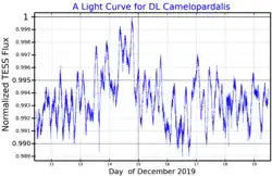 In 1982, Mikołaj Jerzykiewicz and Christiaan L. Sterken reported that 1 Camelopardalis might be a variable star,[17] but some subsequent studies failed to confirm that.[18] Its brightness was convincingly shown to be variable when the Hipparcos data was analyzed. It was given its variable star designation, DL Camelopardalis, in 1999.[19] 1 Camelopardalis A is a variable star with a small amplitude. It has a likely period of 0.22132 days and is thought to be a β Cephei variable or slowly pulsating B-type star.[20] Hipparcos photometry shows an amplitude of 0.035 magnitudes.[21] It has a rotational velocity of 275 km/s, one of the highest known.[10]