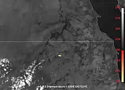 The Times reported that the meteor's "light was so intense that it lit up the sky like a full moon, and an airliner 1,400 km (870 mi) away reported seeing the bright flash."[13] A webcam captured the flash lighting up El-Gouna beach 725 kilometres north of the explosion (see this webcam frame).[14] A low-resolution image of the explosion was captured by the weather satellite Meteosat 8.[15] The Meteosat images place the fireball at 21°00′N 32°09′E / 21.00°N 32.15°E.[16] Infrasound detector arrays in Kenya also detected a sound wave from the direction of the expected impact corresponding to energy of 1.1 to 2.1 kilotons of TNT.[17] Asteroids of this size hit Earth about two or three times a year.[18]