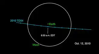 2010 TD54 made its closest approach at 10:51, 12 October 2010 UTC (6:51 EDT a.m.) at 0.000346 AU (51,800 km; 32,200 mi). It is one of the closest known approaches of an asteroid to Earth, at which time the object appeared at a magnitude of 14. It was first observed by of the Catalina Sky Survey's telescopes north of Tucson, Arizona on 9 October 2010.[4]
