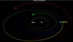 2012 TC4 is a tumbling micro-asteroid classified as a bright near-Earth object of the Apollo group, approximately 10 meters (30 feet) in diameter.[6][7][8] It was first observed by Pan-STARRS at Haleakala Observatory on the Hawaiian island of Maui, in the United States. As of 1 October 2017, it had a small Earth minimum orbital intersection distance of 0.000149 AU (22,300 km).[2] On 12 October 2017, it passed Earth at 0.00033524 AU (50,151 km).[2] The asteroid was removed from the Sentry Risk Table on 16 October 2017[11] and with a 5-year observation arc has a well-known orbit.[2] For example, on the previously risk-listed date of 12 October 2022,[12] it is now known that the asteroid will be more than 3 AU (450 million km) from Earth.[13]