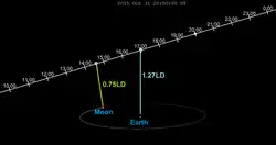 On 31 October 2015 the asteroid passed 0.00191 AU (286,000 km; 178,000 mi) from the Moon and then passed 0.00325 AU (486,000 km; 302,000 mi) from Earth.[7]