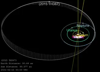 2015 TH367 is a trans-Neptunian object approximately 220 kilometers (140 miles) in diameter. As of 2021 it is approximately 90 AU (13 billion km) from the Sun.[8] At the time of its announcement in March 2018, it was the third most distant observed natural object in the Solar System, after Eris and 2014 UZ224.[c]