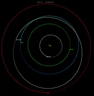 2017 VL2 is an Apollo asteroid, the largest subgroup of near-Earth objects. It orbits the Sun at a distance of 0.9–1.5 AU once every 16 months (498 days; semi-major axis of 1.23 AU). Its orbit has an eccentricity of 0.23 and an inclination of 12° with respect to the ecliptic.[1] It is, however, not a Mars-crossing asteroid, as its aphelion of 1.51 AU is less than the orbit of the Red Planet at 1.666 AU.[1]