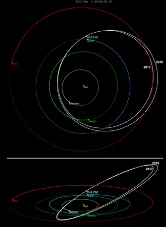 2018 CN2 is a very small asteroid, classified as a near-Earth object of the Apollo group, approximately 5 to 16 meters in diameter. It was first observed by astronomers of the Mount Lemmon Survey at Mount Lemmon Observatory, Arizona, on 8 February 2018, one day prior its close encounter with Earth at 0.18 lunar distances.[1]