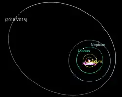 2018 VG18 is the second-most distant natural object ever observed in the Solar System, after 2018 AG37 (132 AU), which was also discovered by Sheppard's team in January 2018. As of 2024, 2018 VG18 is 123.6 AU (18 billion km) from the Sun and is moving farther away until it reaches aphelion in 2063.[8] While 2018 VG18 is one of the most distant Solar System objects known, its orbit is not the most distant since its average orbital distance from the Sun is 82 AU, which places it in the scattered disk and the 2:9 orbital resonance with Neptune.