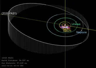 2020 FA31 is a distant trans-Neptunian object that was discovered 97.2 AU (14.54 billion km) from the Sun by Scott Sheppard, David Tholen, and Chad Trujillo on 24 March 2020.[1] Announced on 14 February 2021, it is one of the most distant observable known objects in the Solar System.[4]