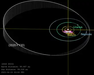 2020 FY30 is a distant trans-Neptunian object that was discovered 100 AU (15 billion km) from the Sun by Scott Sheppard, David Tholen, and Chad Trujillo on 24 March 2020.[1] Announced on 14 February 2021, it is one of the most distant observable known objects in the Solar System.[4]