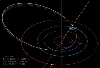 2021 SG is a near-Earth asteroid, with an estimated diameter of 42 to 94 meters, that passed about half a lunar distance from Earth on 16 September 2021. It approached from the direction of the Sun, so it was invisible until a day later.[6] It completes its highly eccentric orbit in 2.24 years. 2021 SG is an Apollo asteroid with a 1.71 AU semimajor axis, and a 0.473 AU perihelion (near Mercury at perihelion) out to a 2.95 AU aphelion (between Mars and Jupiter). With an absolute magnitude (H) of 24.0, it is possibly the largest asteroid to pass within 1 lunar distance of Earth during 2021.[2]