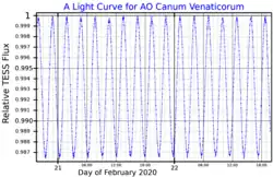 20 Canum Venaticorum is a single[13] variable star in the northern constellation of Canes Venatici, located 238 light years from the Sun. This object has the variable star designation AO Canum Venaticorum; 20 Canum Venaticorum is the Flamsteed designation. It is visible to the naked eye as a faint, white-hued star with an apparent visual magnitude around +4.7. The star is moving further from the Earth with a heliocentric radial velocity of +9 km/s.[7] Eggen (1971) listed this star as a member of the Hyades Stream.[14]