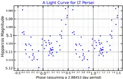 21 Persei is a single,[10] variable star in the northern constellation of Perseus, located about 331 light years away from the Sun. It is visible to the naked eye as a faint, white-hued star with an apparent visual magnitude of 5.10 km/s.[2] The object is moving further from the Earth with a heliocentric radial velocity of +8.5 km/s.[6] It has the variable star designation LT Persei; 21 Persei is the Flamsteed designation.