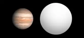The object is a very hot gas giant; the estimated surface temperature is roughly 1200 K (930 °C or 1700 °F),[3] mostly due to gravitational contraction.[8] Its mass is well below the calculated limit for deuterium fusion in brown dwarfs, which is 13 Jupiter masses. The projected distance between 2M1207b and its primary is around 40 AU (similar to the mean distance between Pluto and the Sun).[9] Its infrared spectrum indicates the presence of water molecules in its atmosphere.[10][4] The object is not a likely candidate to support life, either on its surface or on any satellites.
