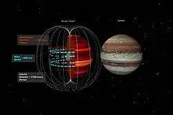 The wind speed is directly inferred from minute, regular cycles in its visible (which matches its ultra-violet) appearance compared to the same at radio wave spectra.[8][9][10][11] The radio emissions are coming from electrons interacting with the magnetic field, which is rooted deep in the interior.[10] The visible and infrared (IR) data, on the other hand, reveal what's happening in the gas giant's cloud tops.[10]