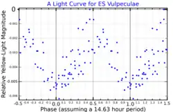 The primary component of the binary is a rapidly rotating Be star[14] with a stellar classification of B1 IV.[5] It is a variable star with an amplitude of 0.06 magnitude and a period of 0.6096 days, tentatively classified as Beta Cephei variable.[6] The variability was discovered in 1959,[15] and it has been assigned the variable star designation ES Vulpeculae.[6]