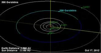 300 Geraldina is a large Main belt asteroid.[1] It was discovered by Auguste Charlois on October 3, 1890, in Nice. The origin of the name is unknown.[2] It is orbiting the Sun at a distance of 3.21 AU with a period of 5.74 yr and an eccentricity (ovalness) of 0.057. The orbital plane is tilted at an angle of 0.73° to the plane of the ecliptic.[1]