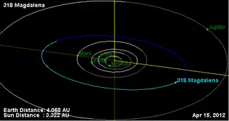 318 Magdalena is a main belt asteroid orbiting the Sun. It was discovered by Auguste Charlois on 24 September 1891 in Nice. It may be named for Mary Magdalene, who in legend travelled to Southern Gaul and is the patron saint of Provence.[3]