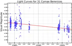 ![]() A visual band light curve for 31 Comae Berenices, adapted from Strassmeier et al. (1997).[1] The red line shows the linear least squares fit to the data. | |