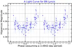 This object is an aging giant star with a stellar classification of K4+ III.[4] A 1993 study found that it varied in brightness by 0.05 magnitude over 25 to 30 days.[12] On the other hand, a 2002 study of the Hipparcos data found a period of 3.5 days.[13] It is classified as a semiregular variable with a brightness that ranges from 4.21 to as low as 4.27, and has the variable star designation BN Lyncis.[6]
