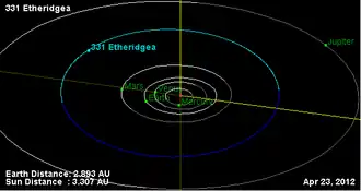 331 Etheridgea is a large main belt asteroid.[1] It was discovered by Auguste Charlois on 1 April 1892 in Nice. The meaning of the name is unknown.[2] This asteroid is orbiting the Sun at a distance of 3.02 AU with a period of 5.26 years and an eccentricity (ovalness) of 0.10. The orbital plane is tilted at an angle of 6.05° to the plane of the ecliptic.[1]