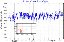 - ↑ Lamers, H. J. G. L. M.; De Groot, M. J. H. (1992). "Observed evolutionary changes in the visual magnitude of the luminous blue variable P Cygni". Astronomy and Astrophysics. 257: 153. Bibcode:1992A&A...257..153L.