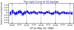 In 1994 it was discovered that 35 Aquilae is a variable star with a pulsation period of just 30 minutes.[11] It was determined to be a Delta Scuti variable, which is a type of star found on the instability strip that undergoes short period pulsations.[4] Observation with the Spitzer Space Telescope shows that 35 Aquilae is radiating an excess level of infrared radiation for a star of its type. This excess may be explained by the heating of nearby interstellar dust belonging to a diffuse cloud of material that the star is passing through. This interaction may also explain the Lambda Boötis categorization for this star.[6]