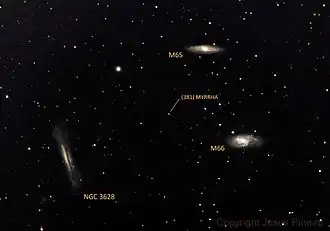 ![]() 381 Myrrha photographed in the constellation of Leo, with Messier 65, Messier 66 and NGC 3628 nearby | |