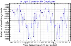 In 1995 Gregory W. Henry et al. announced that 42 Capricorni is a variable star, a discovery that was made during a survey of chromospherically active late-type stars using an automated telescope.[13] It was given its variable star designation, BY Capricorni, in the year 2000.[14] The star is an RS Canum Venaticorum variable, indicating the presence of an active chromosphere with star spots.[5]