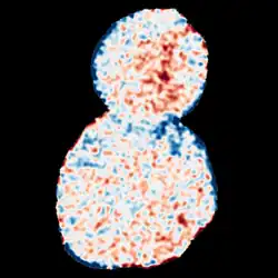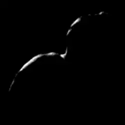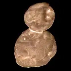 Prior to the New Horizons flyby of Arrokoth, stellar occultations by Arrokoth had provided evidence for its bilobate shape.[44] The first detailed image of Arrokoth confirmed its double-lobed appearance and was described as a "snowman" by Alan Stern, as the lobi appeared distinctively spherical.[45] On 8 February 2019, one month after the New Horizons flyby, Arrokoth was found to be more flattened than initially thought, based on additional images of Arrokoth taken by New Horizons after its closest approach. The flattened lobus Wenu was described as a "pancake", while Weeyo was described as a "walnut" as it appeared less flattened. By observing how the unseen sections of Arrokoth occulted background stars, scientists were able to then outline the shapes of both lobi.[46] The cause of Arrokoth's unexpectedly flattened shape is uncertain, with various explanations including sublimation or centrifugal forces.[47][48]