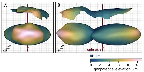 Arrokoth is a contact binary consisting of two lobes (lobi) attached by a narrow neck or waist, which is encircled by a bright band named Akasa Linea.[31] The lobi were likely once two objects that later merged in a slow collision.[40] The larger lobus, Wenu, is measured at about 21.6 km (13.4 mi) across its longest axis[41] while the smaller lobus, Weeyo, is measured at 15.4 km (9.6 mi) across its longest axis.[42] Wenu is lenticular in shape, being highly flattened and moderately elongated.[41] Based on shape models of Arrokoth constructed from images taken by the New Horizons spacecraft, the dimensions of Wenu are approximately 21 km × 20 km × 9 km (13.0 mi × 12.4 mi × 5.6 mi). In contrast, Weeyo is less flattened, with dimensions of 15 km × 14 km × 10 km (9.3 mi × 8.7 mi × 6.2 mi). As a whole, Arrokoth is 36 km (22 mi) across its longest axis and is about 10 km (6.2 mi) thick, with the centers of the lobi separated from each other by 17.2 km (10.7 mi).[10][43]