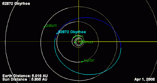 52872 Okyrhoe /oʊˈkɪroʊ.iː/ is a centaur orbiting in the outer Solar System between Jupiter and Saturn. It was discovered on 19 September 1998, by the Spacewatch survey at Kitt Peak Observatory in Arizona, United States, and named after Ocyrhoe from Greek mythology.