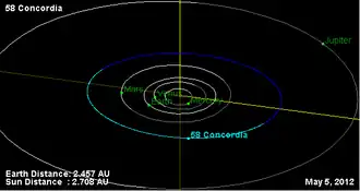 58 Concordia is a fairly large main-belt asteroid that is orbiting the Sun with a period of 4.44 years, a semimajor axis of 2.7 AU, and a low eccentricity of 0.043. It is classified as a C-type asteroid, meaning that its surface is very dark and it is likely carbonaceous in composition. The surface spectra displays indications of hydrated minerals created through aqueous alteration.[5] The object is rotating with a sidereal period of 9.894541 h and pole orientations of (15.3°±0.7°, −4.2°±2.6°) and (195.9°±1.0°, 4.8°±1.2°).[6] It belongs to the Hungaria family of asteroids and has a satellite with an orbital period of 14.29 h.[3]