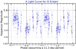This is a BY Draconis variable with the designation IX Eridani, which ranges in magnitude from 5.47 down to 5.51 with a period of 11.3 days.[3] The X-ray emissions from this star's corona indicate an age of less than a billion (109) years,[13] compared to 4.6 billion for the Sun, so it is still relatively young for a star of its mass. Starspot activity has also been detected, which varies from year to year.