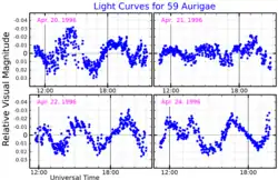 - ↑ Zhiping, Li (October 2000). "Complicated pulsation in the delta Scuti variable 59 Aurigae". Astronomy and Astrophysics. 362: 595–598. Bibcode:2000A&A...362..595L. Retrieved 31 October 2021.