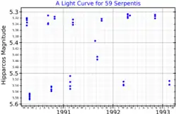 59 Serpentis, also known as d Serpentis, is a multiple star in the constellation Serpens.[2] The system shows irregular variations in brightness between magnitudes 5.17 and 5.29.[3]