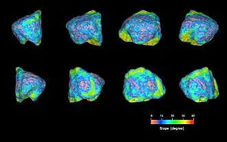Golevka is a small object, measuring 0.6 × 1.4 km. The radar observations revealed that it has a very strange, angular shape that looks different depending on the direction. In 2003 the Yarkovsky effect was first observed at work by high-precision radar observations of Golevka.[2] Between 1991 and 2003, the small force of the Yarkovsky effect caused a shift of 15 kilometers (9.3 mi) from what would be expected based on only gravitational interactions.[2] This helped evaluate the asteroid's bulk density (2.7 ± 0.5 g/cm3) and mass (2.10×1011 kg).