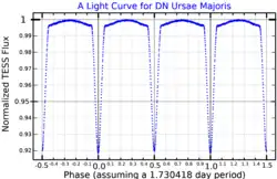 65 Ursae Majoris A is a variable star with the variable star designation DN Ursae Majoris. The pair Aa1 and Aa2 form an eclipsing binary as they periodically pass in front of each other while orbiting. The primary and secondary eclipses are almost identical and the apparent magnitude of the system varies between 6.55 and 6.65 twice during each orbit of 1.73 days.[16] The brightness variation is very small because the non-eclipsing component Ab is the brightest of the three stars and contributes 80% of the visible light.[5]