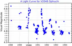 66 Ophiuchi is a binary[6] variable star[13] in the equatorial constellation of Ophiuchus. It has the variable star designation V2048 Ophiuchi, while 66 Ophiuchi is the Flamsteed designation. This object is visible to the naked eye as a faint, blue-white hued point of light with a baseline apparent visual magnitude of 4.60.[2] It is located approximately 650 light years away from the Sun based on parallax,[1] but is drifting closer with a radial velocity of −13 km/s.[5] The star has a peculiar velocity of 13.1±3.2 km/s[14] relative to its neighbors.