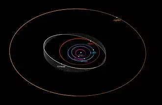 Hebe orbits the Sun with an average distance (or semi-major axis) of 2.426 astronomical units (AU),[1] placing it in the inner section of the main asteroid belt.[21]: 1282 Its distance to the Sun varies from 1.935 AU at perihelion to 2.917 AU at aphelion due to its moderately elliptical orbit, indicated by its orbital eccentricity of 0.202. It has an orbital period of 3.778 Earth years, following an orbit inclined by 14.74° with respect to the ecliptic plane.[1]